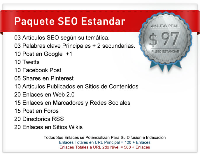 Nuestra SEO paquetes son cuidadosamente diseñado para ofrecerle una de las estrategias de optimización más efectiva. El método de SEO es muy simple, pero muy potente para ayudar a su sitio web se mueve en los resultados de búsqueda de sus frases de palabras clave específicas y para asegurarse de que usted recibe la primera calidad de visitantes únicos adicionales para su sitio web.